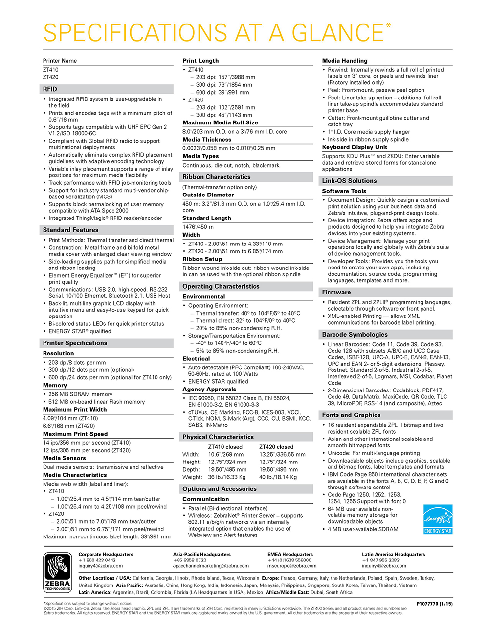 - 용지폭 : 25mm-114mm - tear & cutter - 인쇄폭 : 104 mm - 해상도 : 203dpi / 300dpi - 인쇄속도 : 61~ 356 mm/sec - 메모리 : 512 MB DRAM, 256MB Flash