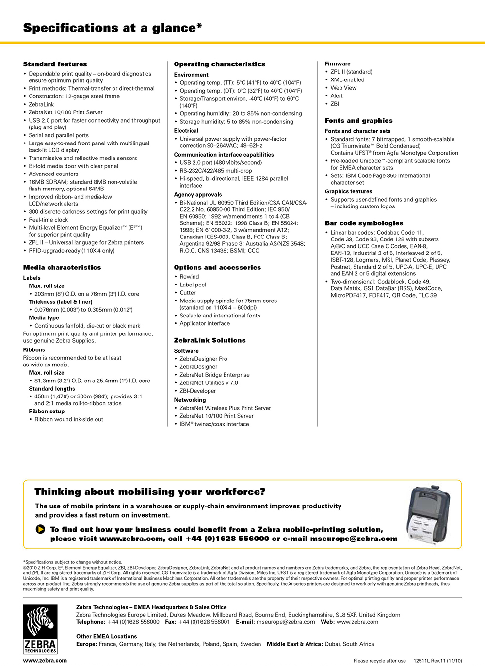 - 용지폭 : 20mm-114mm - 인쇄폭 : 102mm(203,300dpi) / 81mm(600dpi) - 해상도 : 203 / 300 / 600dpi - 인쇄속도 : Up to 14 - 메모리 : 16MB SDRAM, 8MB Flash